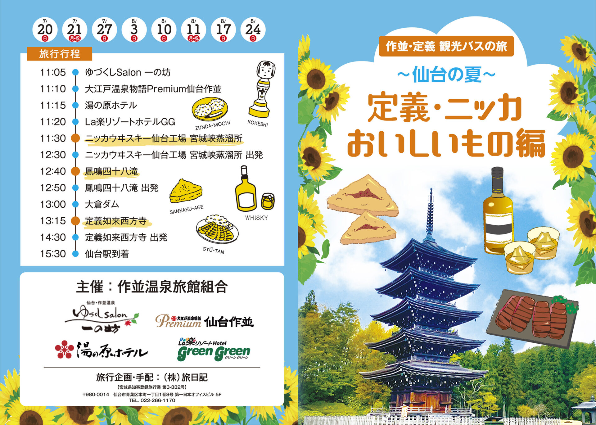 内容:仙台の夏、バスによりニッカウヰスキー仙台工場 宮城峡蒸留所、鳳鳴四十八滝・定義如来西方寺巡り、作並のグルメと自然、歴史を堪能できるバス観光です。